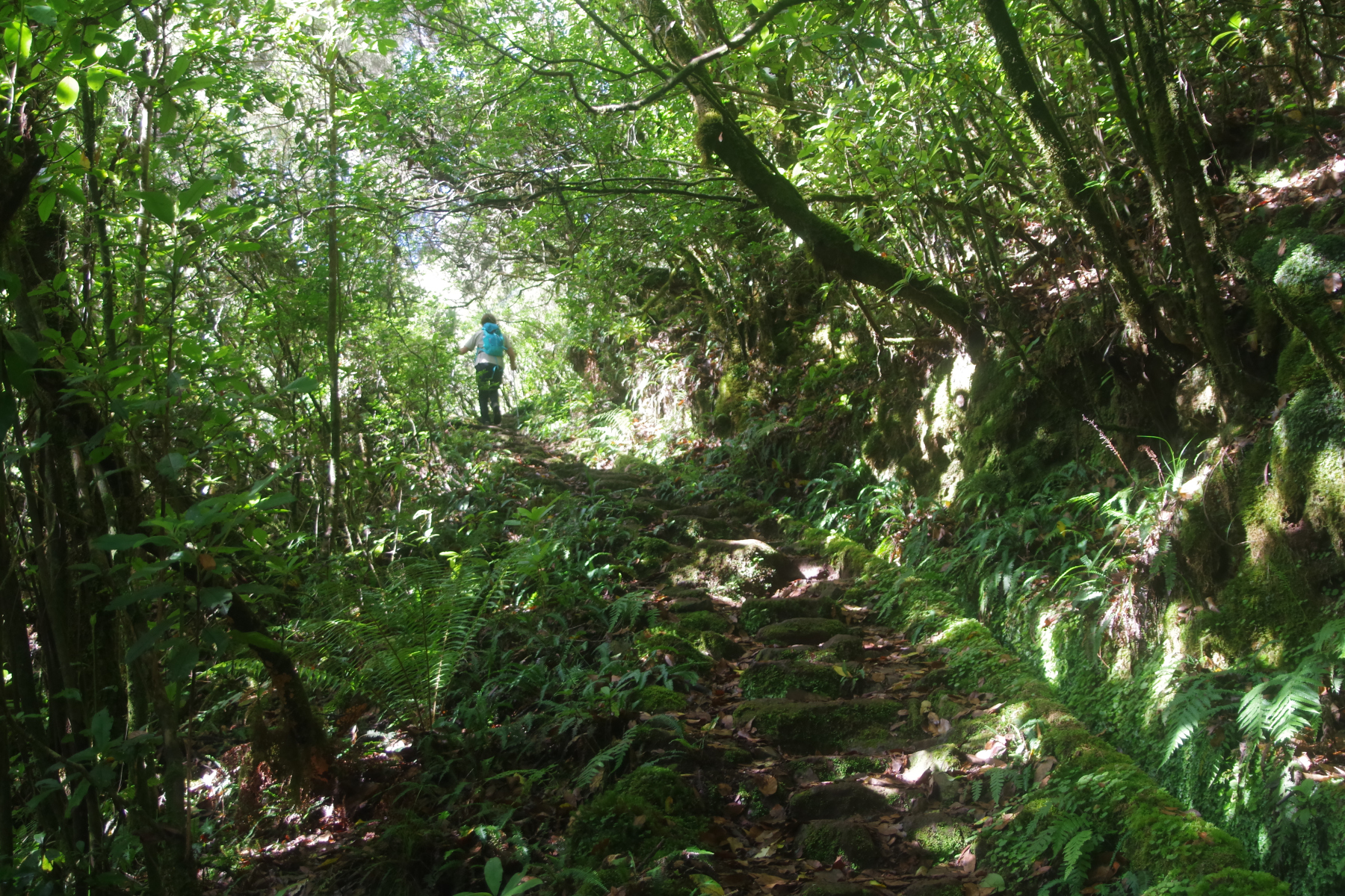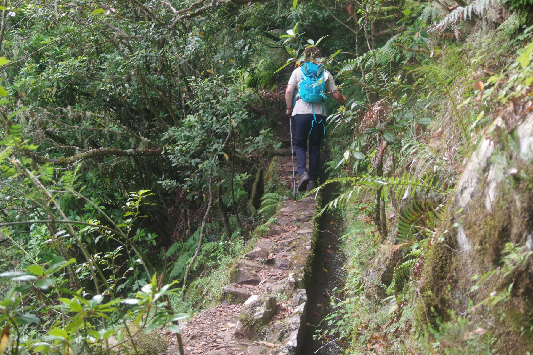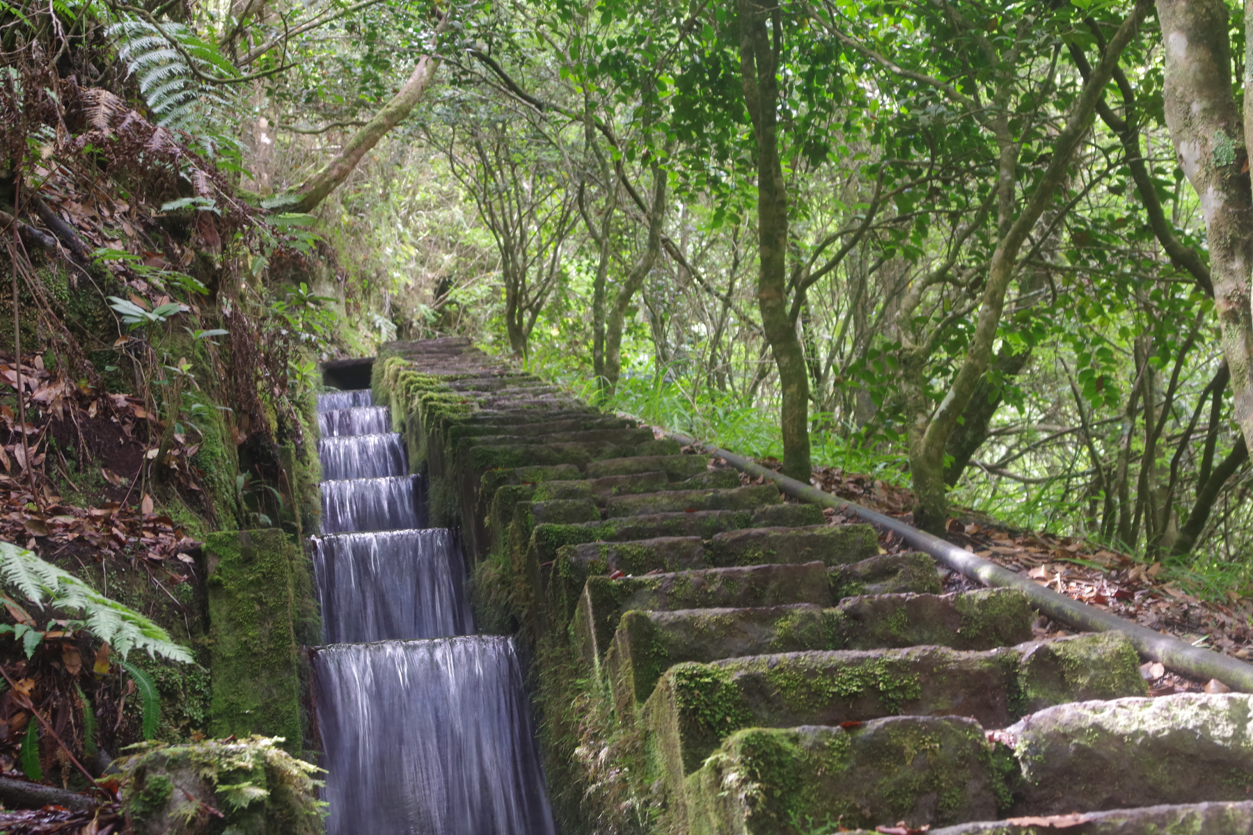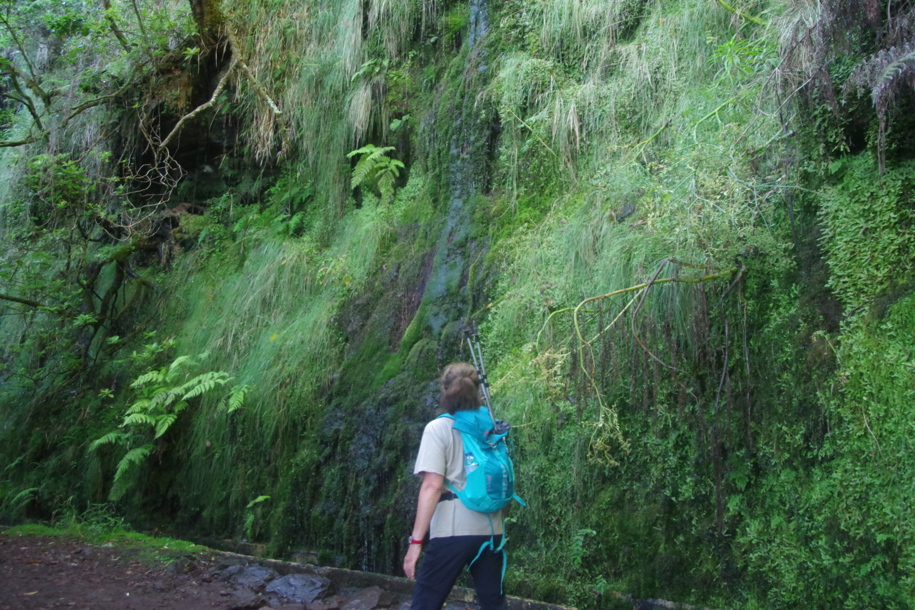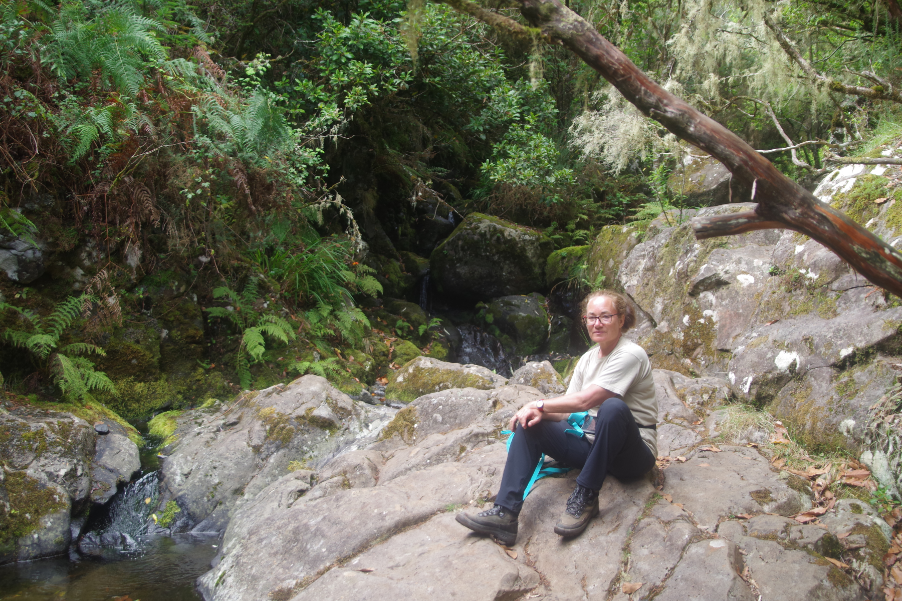 So geht es rauf ins Gebirge, zum Ribeiro Frio. Von dort wandern wir erst an der Levada de Furado entlang, steigen aber dann steil (wieder einmal) zur Hochebene Feiteiras de Beixo auf. Der Weg durch den Lorbeerwald die Levadas hinauf ist schattig und kühl, Wasserfälle spenden Feuchtigkeit, machen aber den Weg auch ziemlich glitschig. Beim Quelltümpel der Levada machen wir Rast vor einem Wasserfall. Wunderschön und überraschenderweise ziemlich einsam. Wir treffen nur wenige Wanderer, die Kreuzfahrer sind heute woanders.
