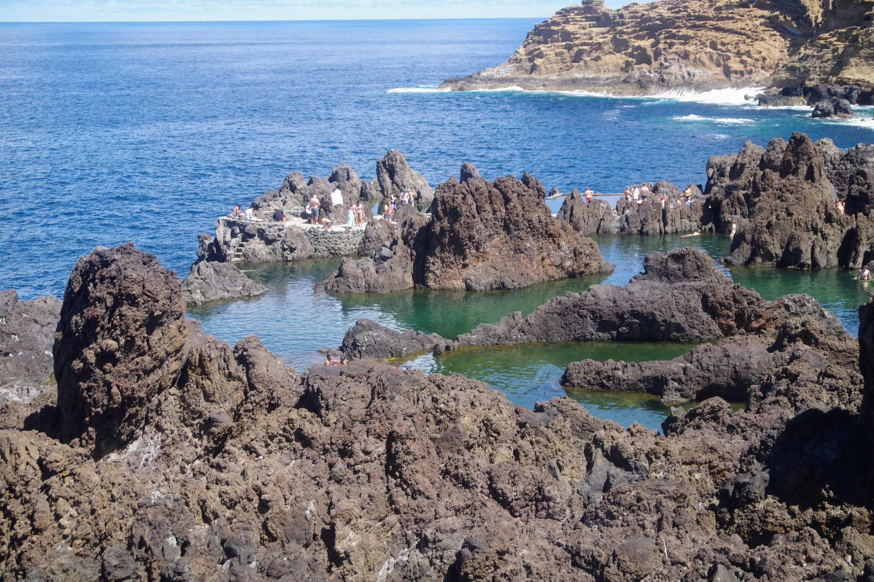 Nach dieser sehr zufriedenstellenden Morgensporteinlage fahren wir, diesmal absichtlich, weiter über und unter den Bergen, an so manchem Miradauro vorbei gen Nordwesten. Bis wir in Porto Moniz in den berühmten Lavabecken planschen können. Auch der hübsche Ort Seixal hätte zwei nette Strände, jedoch keinen Parkplatz zu bieten. Deshalb kehren wir um und fahren, diesmal auf der Schnellstraße, wieder nach Hause.