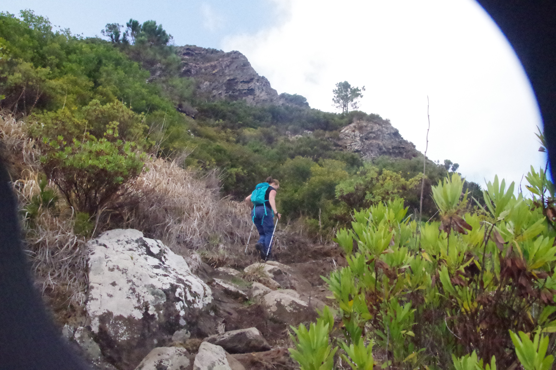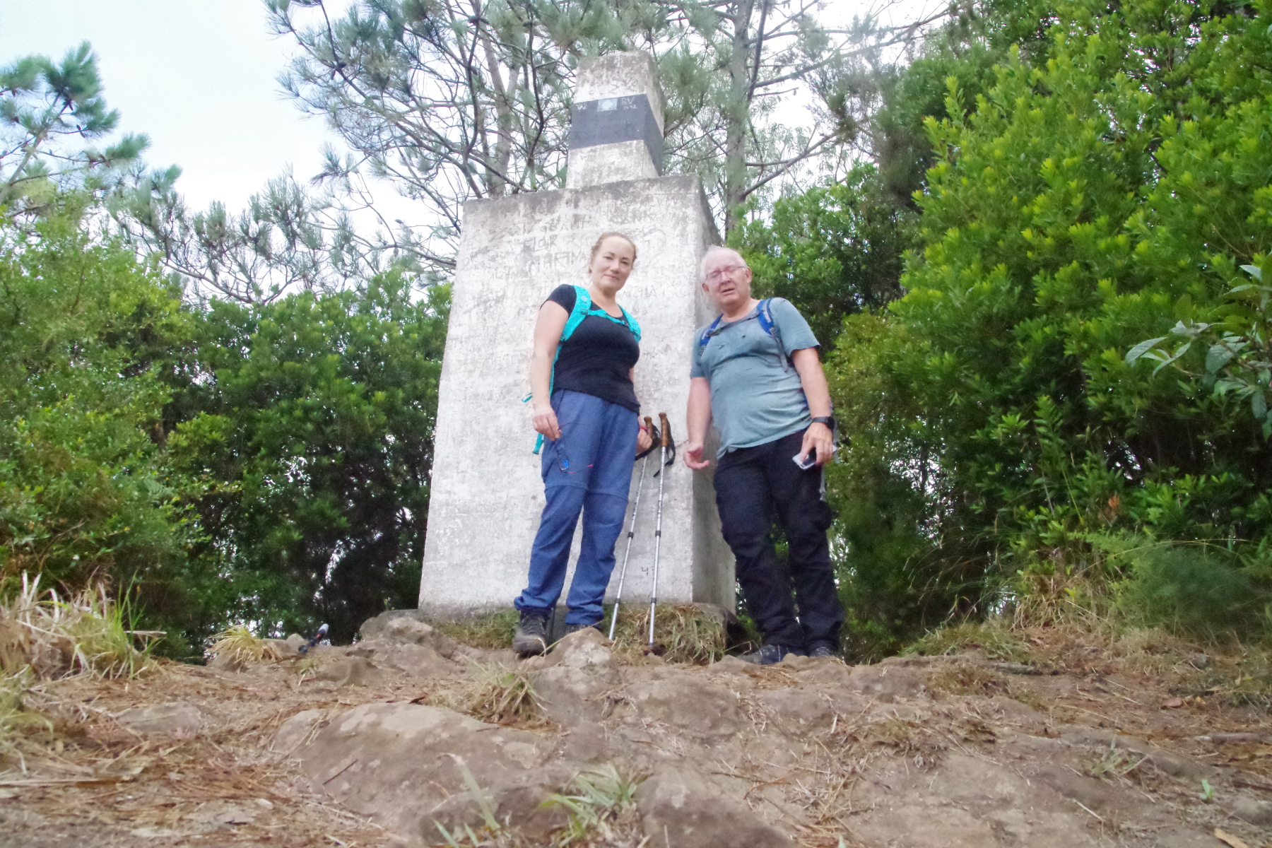 Wir starten den Tag schon in der Morgendämmerung mit Nespresso auf der Terrasse. So gegen 08:00 (!) geht dann die Sonne auf, bis Mittag soll es trocken bleiben. Eine kurze Tour ist da wohl drinnen, unser Hausberg lacht mit seiner schroffen Wand zu uns herunter. Auf der Rückseite gibt es einen Weg, bis zum Startpunkt hat unser Micra schon etliche Höhenmeter und Talquerungen geschafft. Steile 320 Höhenmeter mit so manch kleiner Kraxlerei später stehen wir verschwitzt oben, am Gipfel des penha de aquia. Von Adlern nichts zu sehen, auch sonst der Gipfelblick durch die Vegetation verstellt.