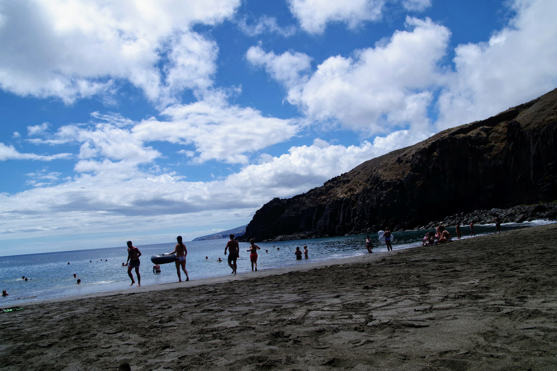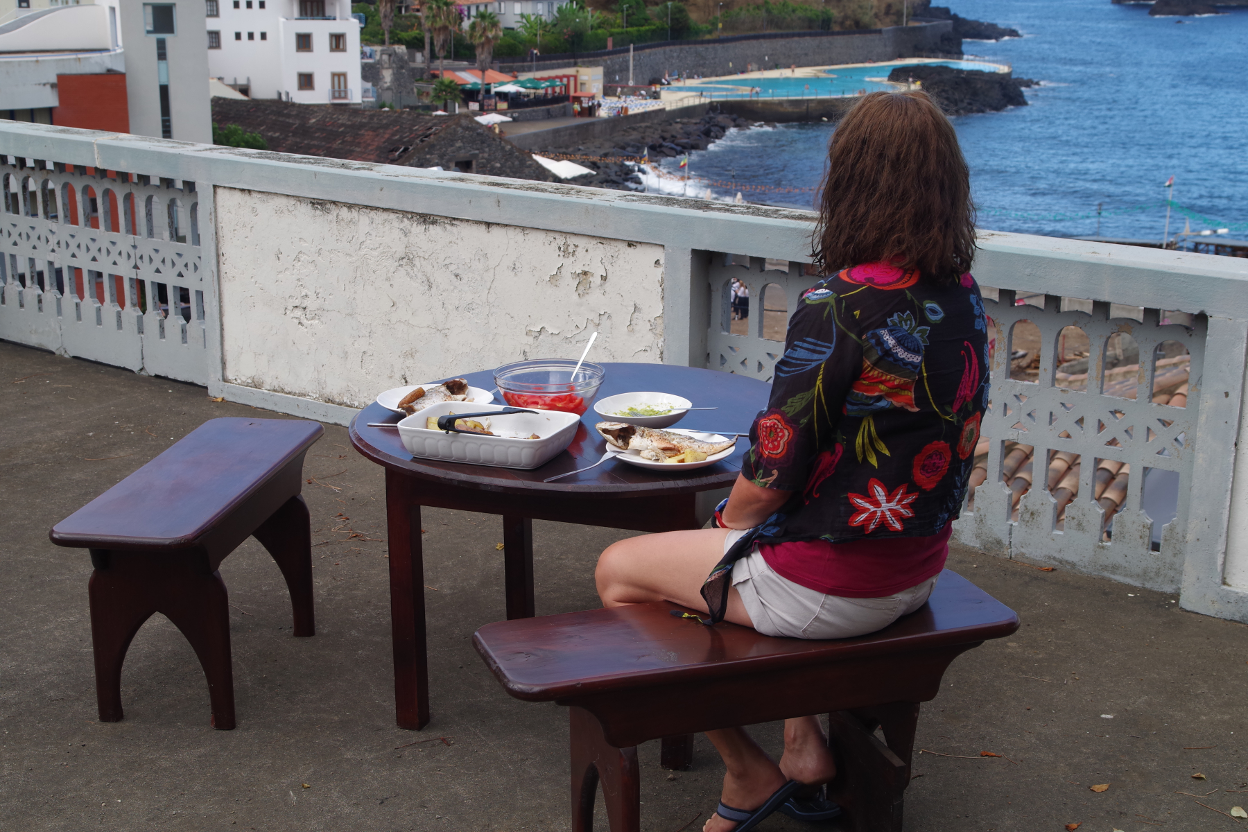 Zur Abkühlung besuchen wir anschließen noch Madeiras einzigen natürlichen Sandstrand. Dieser liegt sehr idyllisch in einer tief eingeschnitten Bucht, mit Brandung und Strandcafe, wie es sich gehört. Nachteil: Bis man wieder oben beim Auto ist, braucht man schon wieder eine Abkühlung….